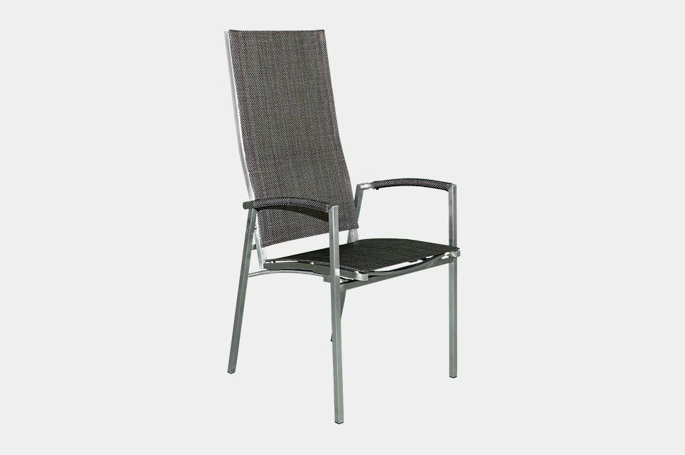 Das attraktive Gestell besteht aus Vierkantrohren in gebürstetem Edelstahl. Der Gartenstuhl Diva ist stapelbar und lässt sich somit platzsparend verstauen. An den Armlehnen befindet sich eine zusätzliche Bespannung aus Batyline-Gewebe, damit Sie die Arme komfortabel abstützen können – damit Sie auch bei längeren Sessions stets komfortabel sitzen und verweilen können.