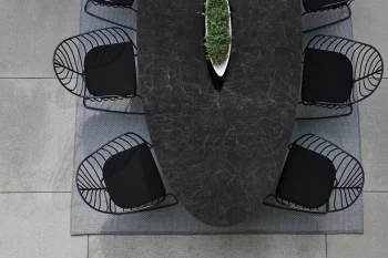 Die charakteristische Form der Beine des Gartentisch FOREST von Fast Spa wurde vom mathematischen Zeichen der Quadratwurzel inspiriert. Die Tischplatte kann wahlweise quadratisch, rechteckig oder rund gewählt werden und ist auch mit einer gesprenkelter Oberfläche erhältlich. Made in Italy.