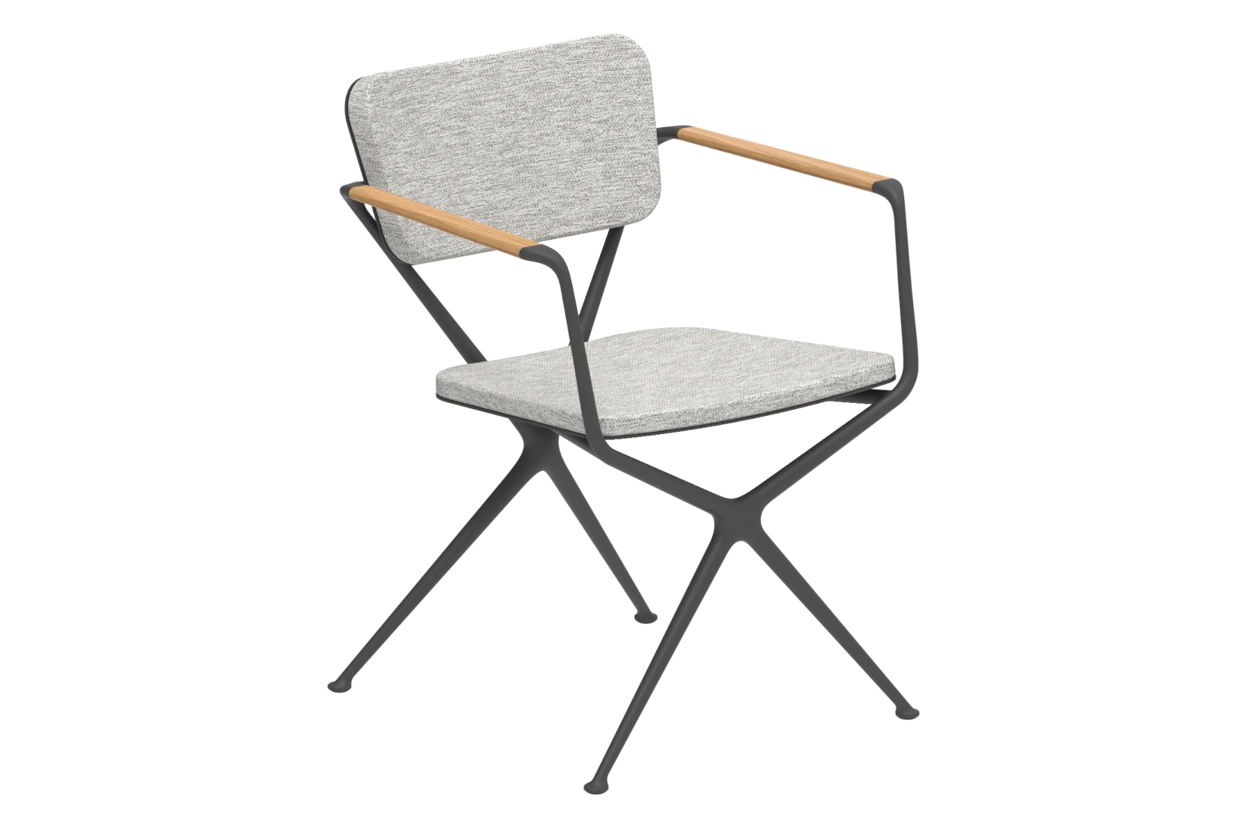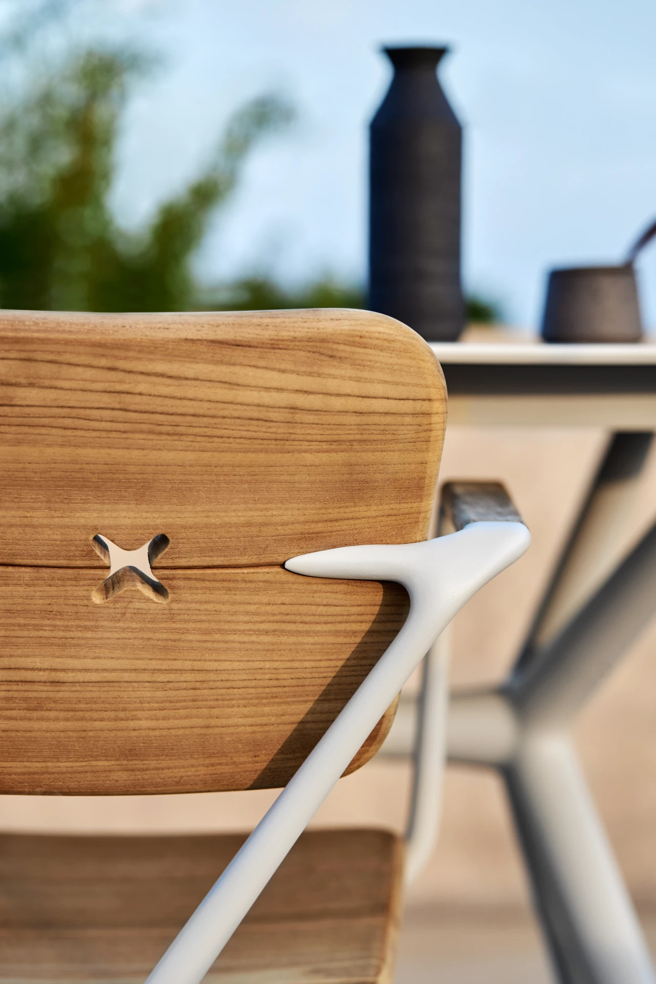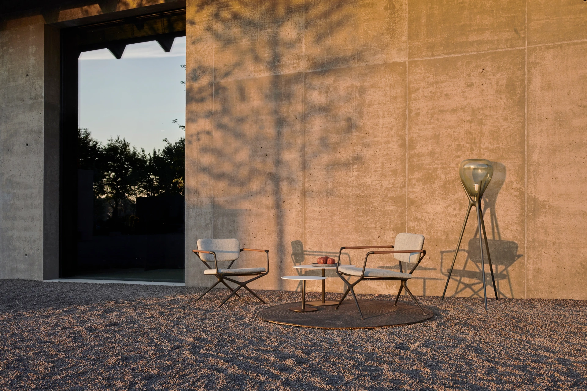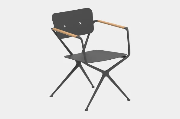 Das Aluminiumgussgestell des Gartenstuhl Exes besteht aus zwei X-förmigen Rahmen, deren fliessende, organische Linien nur durch die konisch zulaufenden Armlehnen aus Teakholz unterbrochen werden, welche dem Sessel Exes von Royal Botania ein warmes Design verleihen. Die nahtlos integrierte, gebogene Rückenplatte verfügt über zwei X-förmige Öffnungen, welche nicht nur als ästhetisches Merkmal dienen, sondern auch als Befestigungspunkte für das Rückenpolster. Die X-förmigen Knöpfe des Rückenpolsters werden standardmässig in der Farbe des Rahmens geliefert, die Knöpfe sind jedoch wahlweise auch in Teakholz erhältlich, welche die ideale Ergänzung zu den Teak-Armlehnen des Stuhls sind und ihn dadurch zu einem noch grösseren Blickfang machen. Passend zum Essstuhl Exes von Royal Botania, der auch in der Variante eines Loungesessels gekauft werden kann, bietet sich der Gartentisch Exes an, welcher mit einem Tischgestell in 2 unterschiedlichen Designs erhältlich ist: Eine spektakuläre Dreifussvariante, welche für eine runde Platte von 160cm geeignet ist, bei der sich alle drei Beine an einem Punkt auf halber Strecke zwischen Boden und Tischplatte kreuzen. Das alternative Gestell hat vier Beine und kann mit einer elliptischen Platte von 320cm oder einer ovalen Platte von 220cm oder 300cm kombiniert werden. Die Tischplatten sind in Teakholz und in Keramik in verschiedenen Farben und Texturen erhältlich. Für das Gestell stehen Schwarz, Bronze, Weiss und sandbeschichtetes Aluminium zur Auswahl.