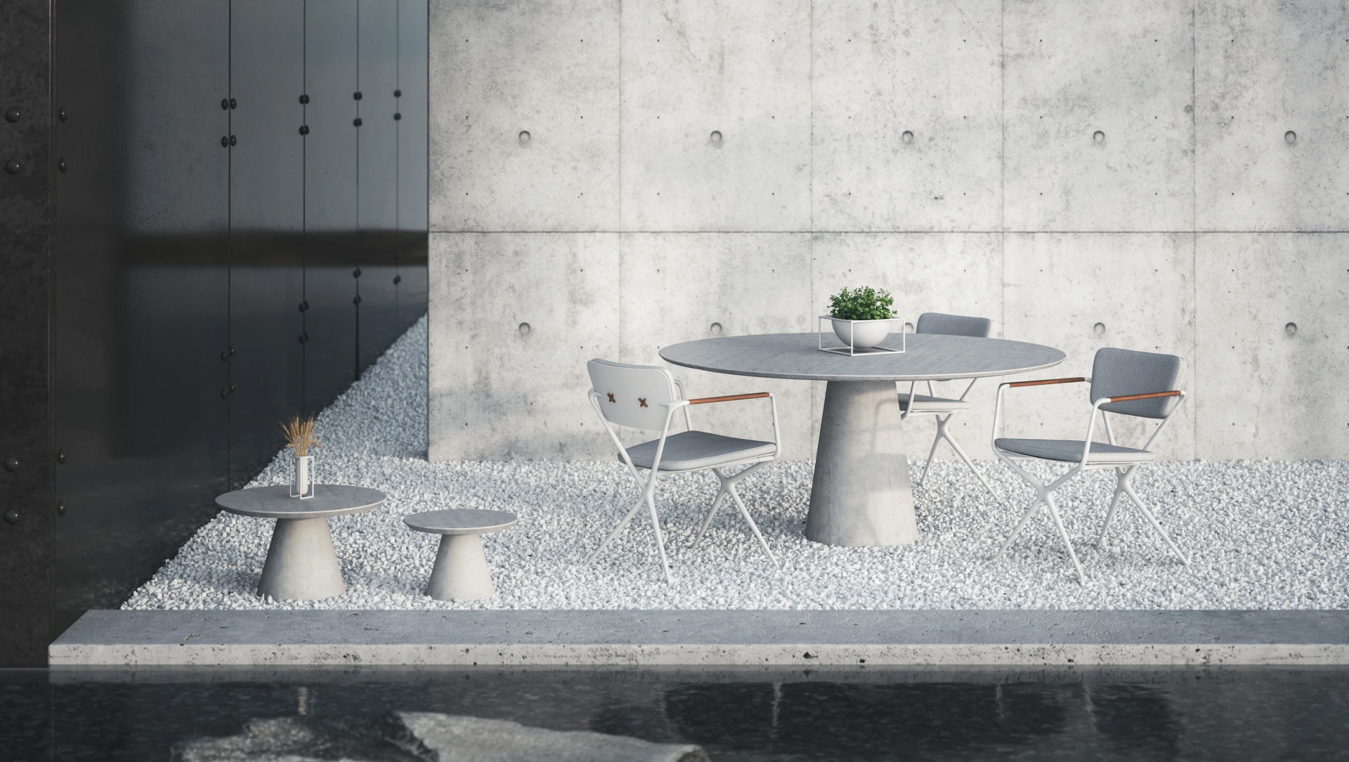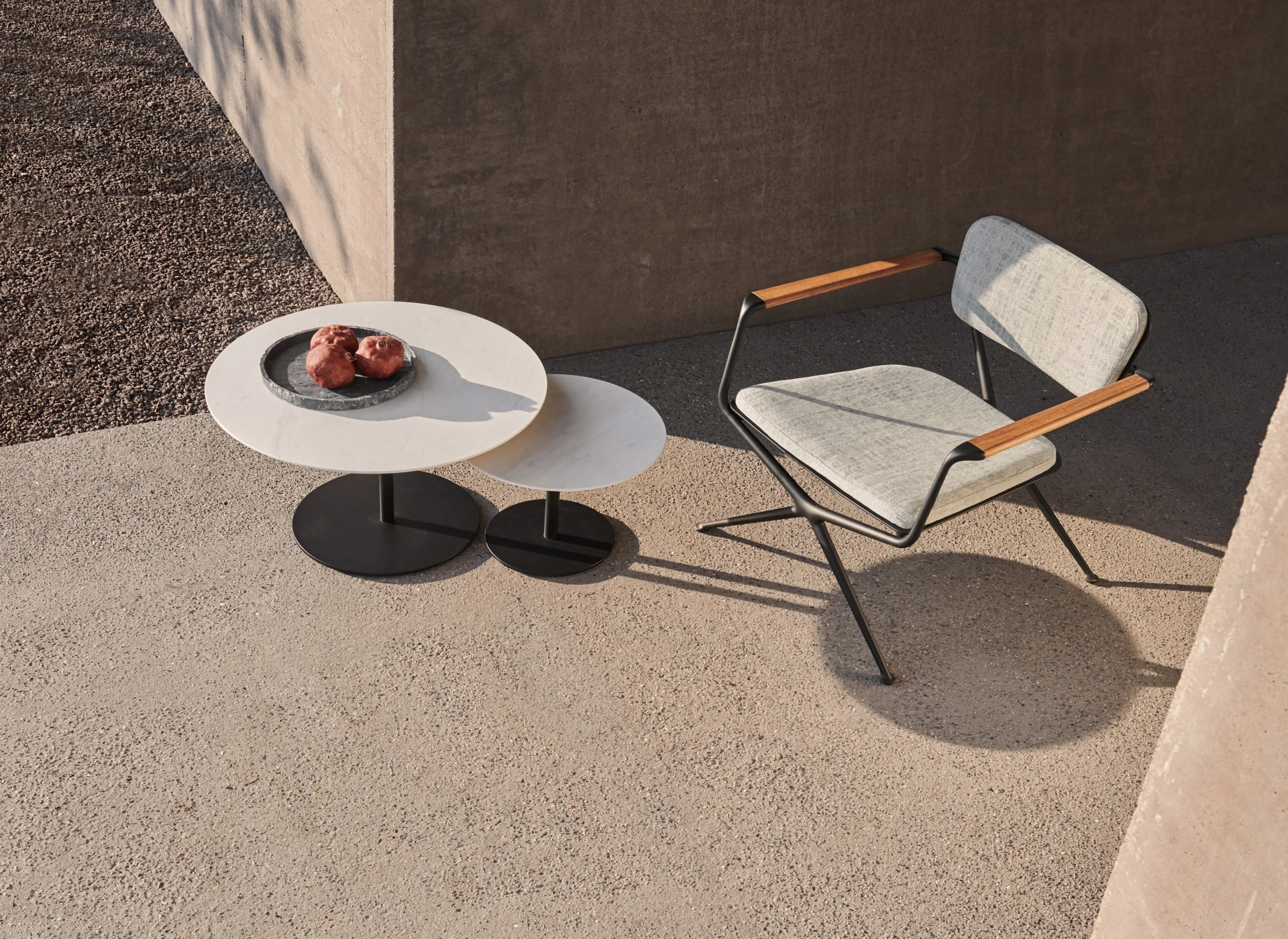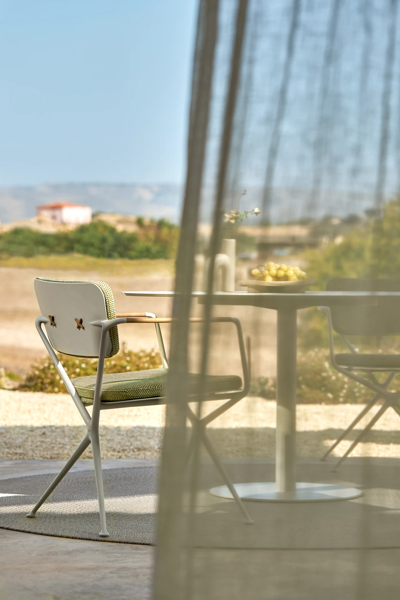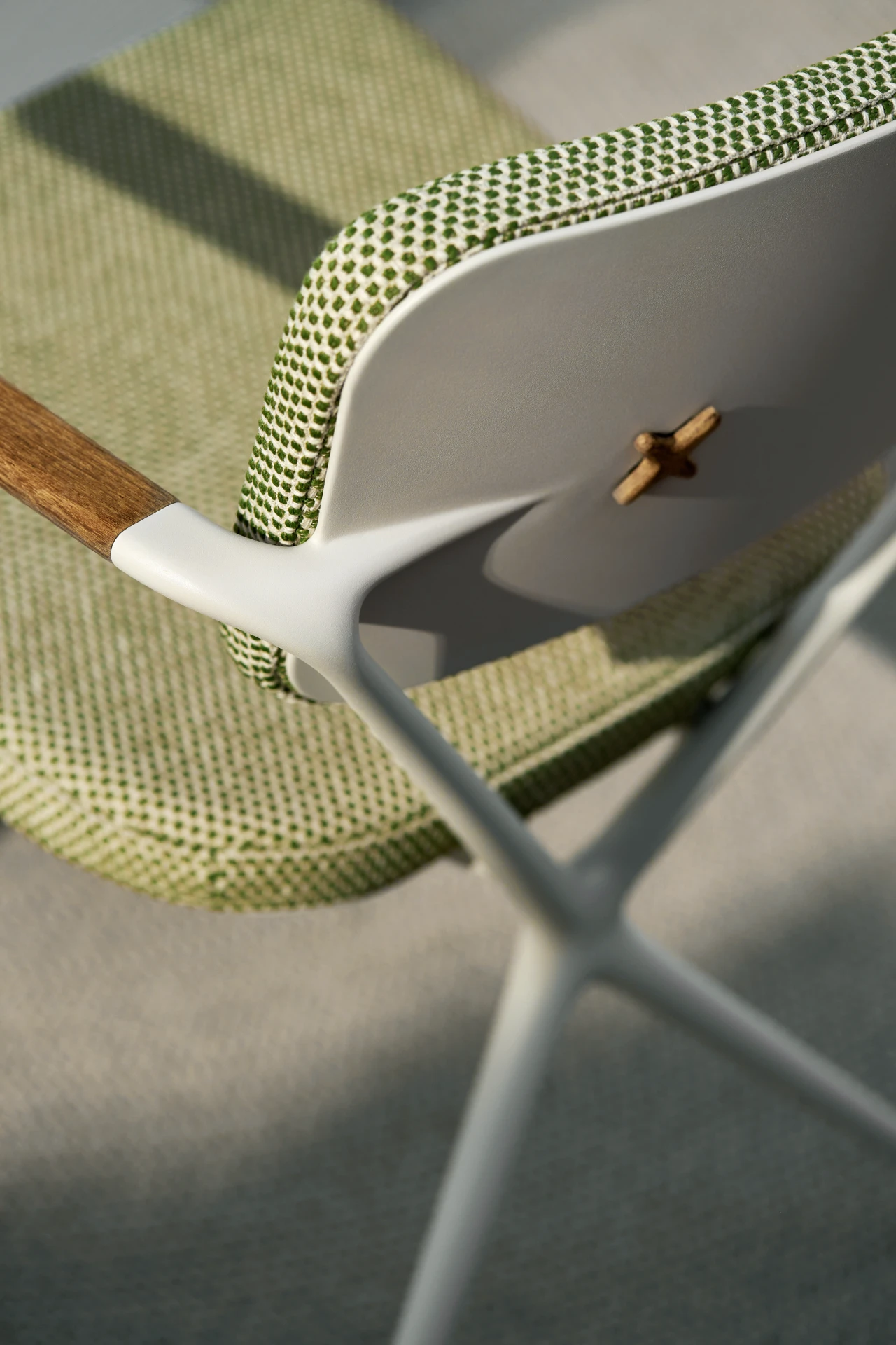 Das Aluminiumgussgestell des Gartenstuhl Exes besteht aus zwei X-förmigen Rahmen, deren fliessende, organische Linien nur durch die konisch zulaufenden Armlehnen aus Teakholz unterbrochen werden, welche dem Sessel Exes von Royal Botania ein warmes Design verleihen. Die nahtlos integrierte, gebogene Rückenplatte verfügt über zwei X-förmige Öffnungen, welche nicht nur als ästhetisches Merkmal dienen, sondern auch als Befestigungspunkte für das Rückenpolster. Die X-förmigen Knöpfe des Rückenpolsters werden standardmässig in der Farbe des Rahmens geliefert, die Knöpfe sind jedoch wahlweise auch in Teakholz erhältlich, welche die ideale Ergänzung zu den Teak-Armlehnen des Stuhls sind und ihn dadurch zu einem noch grösseren Blickfang machen. Passend zum Essstuhl Exes von Royal Botania, der auch in der Variante eines Loungesessels gekauft werden kann, bietet sich der Gartentisch Exes an, welcher mit einem Tischgestell in 2 unterschiedlichen Designs erhältlich ist: Eine spektakuläre Dreifussvariante, welche für eine runde Platte von 160cm geeignet ist, bei der sich alle drei Beine an einem Punkt auf halber Strecke zwischen Boden und Tischplatte kreuzen. Das alternative Gestell hat vier Beine und kann mit einer elliptischen Platte von 320cm oder einer ovalen Platte von 220cm oder 300cm kombiniert werden. Die Tischplatten sind in Teakholz und in Keramik in verschiedenen Farben und Texturen erhältlich. Für das Gestell stehen Schwarz, Bronze, Weiss und sandbeschichtetes Aluminium zur Auswahl.
