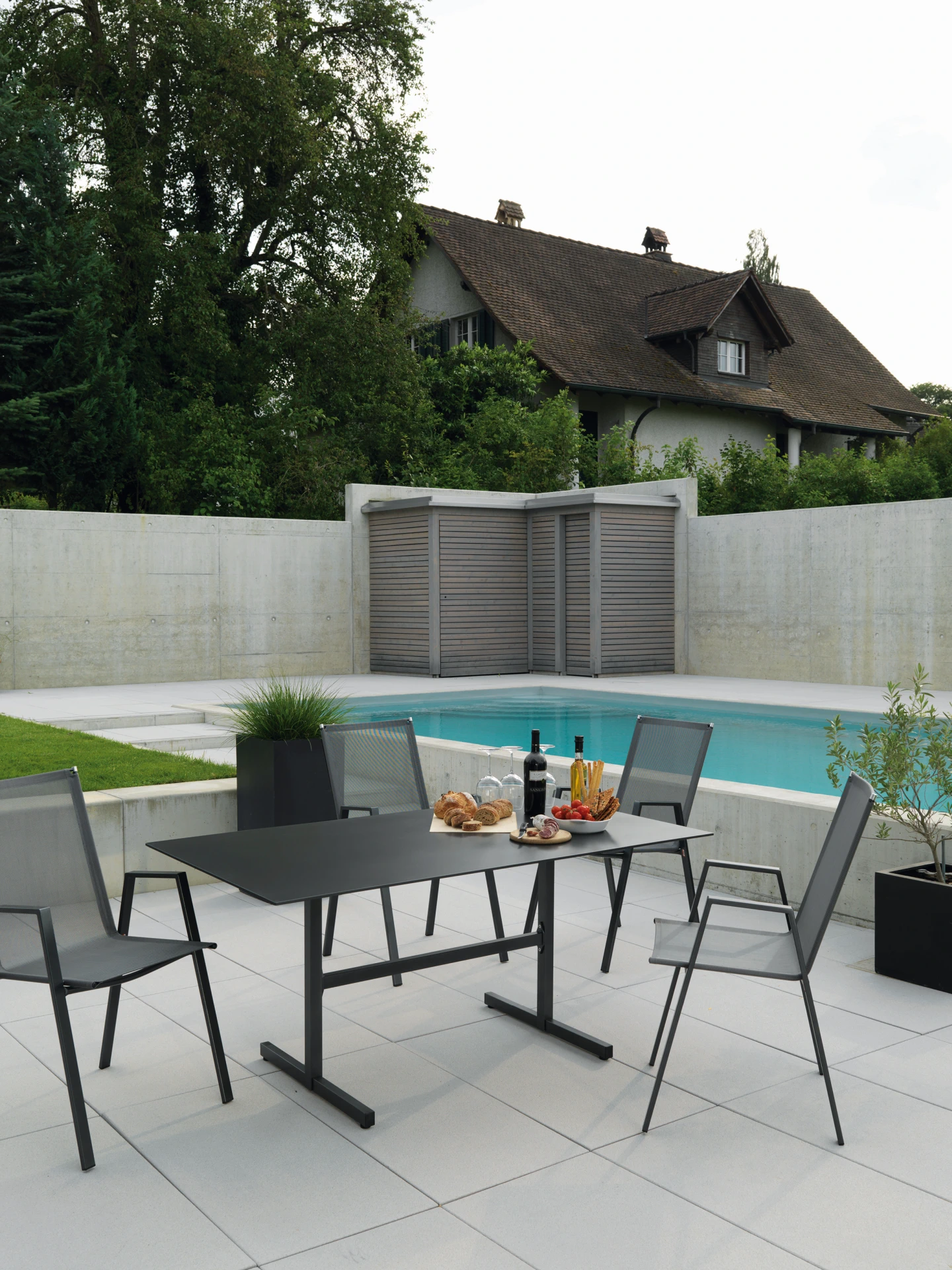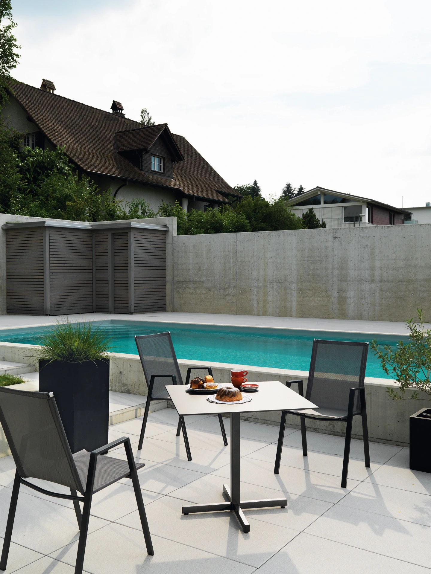 Der Fiberglastisch Basel eignet sich somit ideal für den Einsatz im Aussenbereich – Von korrosiven Umgebungen wie Pools über exponierte Balkone und Veranden bis hin zu windigen Terrassen von Gastrobetrieben und Hotels. Dank der witterungsbeständigen Materialien bleibt der Tisch auch bei starkem Regen, Wind oder UV-Strahlung in Top-Zustand, ohne an Qualität zu verlieren oder Rost anzusetzen.
