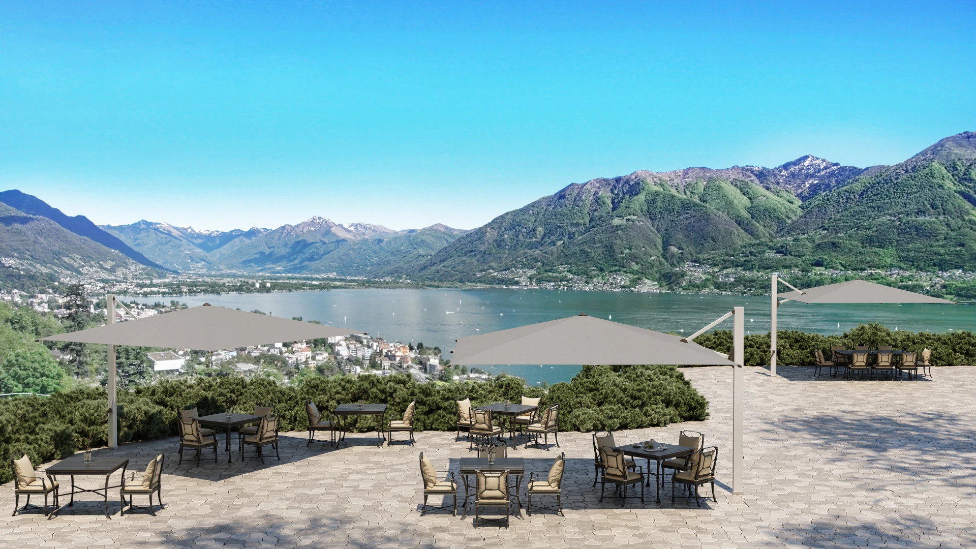 Mit seiner beeindruckenden Spannweite sorgt der Ambiente Nova für grossflächigen Schatten und ein luxuriöses Ambiente. Dank seiner abnehmbaren Komfort-Kurbel lässt sich das Schirmdach mühelos öffnen und schliessen. Das Schirmdach kann vergleichsweise hoch geschlossen werden, sodass Tischgruppen unter der Schirmfläche nicht verschoben werden müssen.