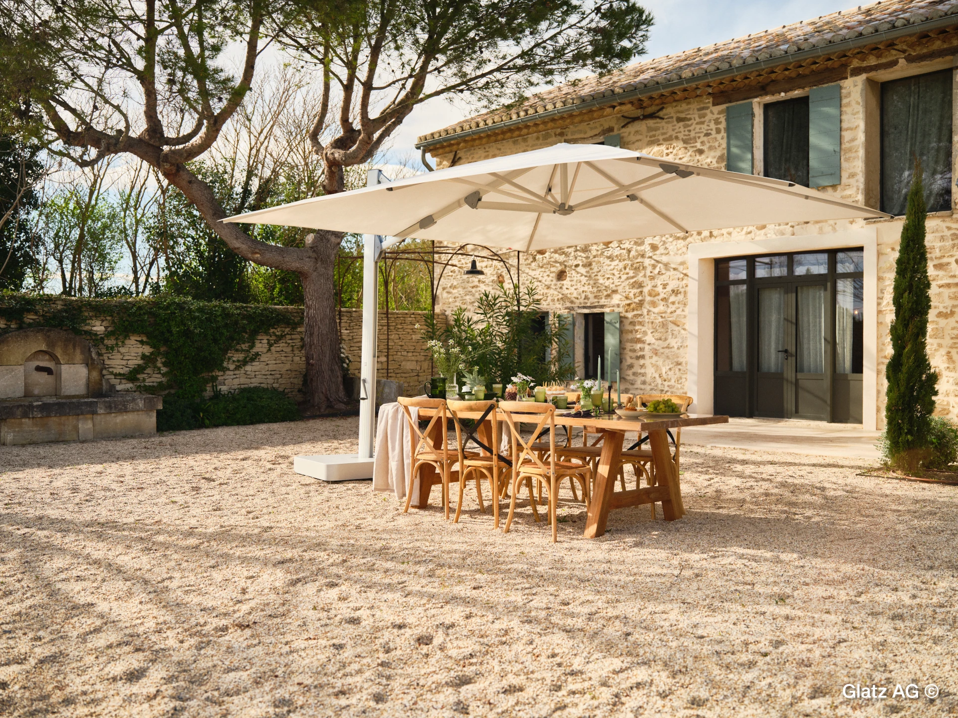 Das Design dieses Sonnenschirms wurde in der Schweiz konzipiert und er wird in der Schweiz hergestellt. Die Glatz AG ist ein Schweizer Familienunternehmen mit über 125-jähriger Tradition in der Entwicklung, Herstellung und im Vertrieb von hochwertigen Sonnenschirmen für den privaten und gewerblichen Einsatz.