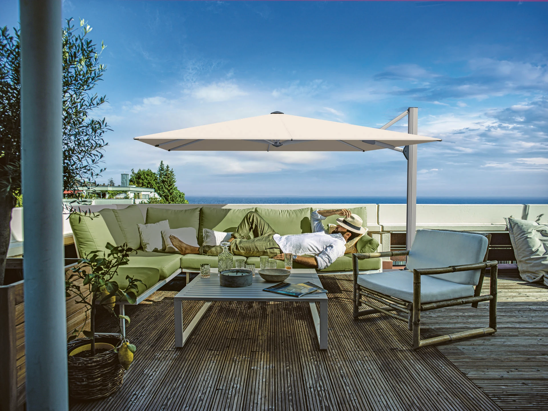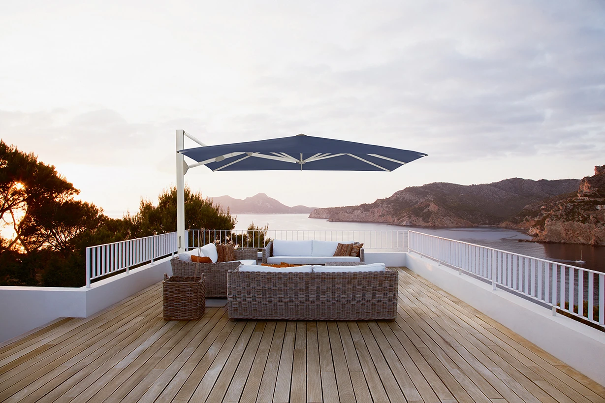 AMBIENTE Nova ist der grösste Ampelschirm im Sortiment von Glatz und bietet optimalen Schutz vor Sonne und Hitze. Neben den auf dieser Produktseite aufgeführten Standardgrössen ist dieser Grossschirm auf Anfrage auch in Sondergrössen erhältlich, um den Platzverhältnissen jedes Outdoor-Bereichs gerecht zu werden.