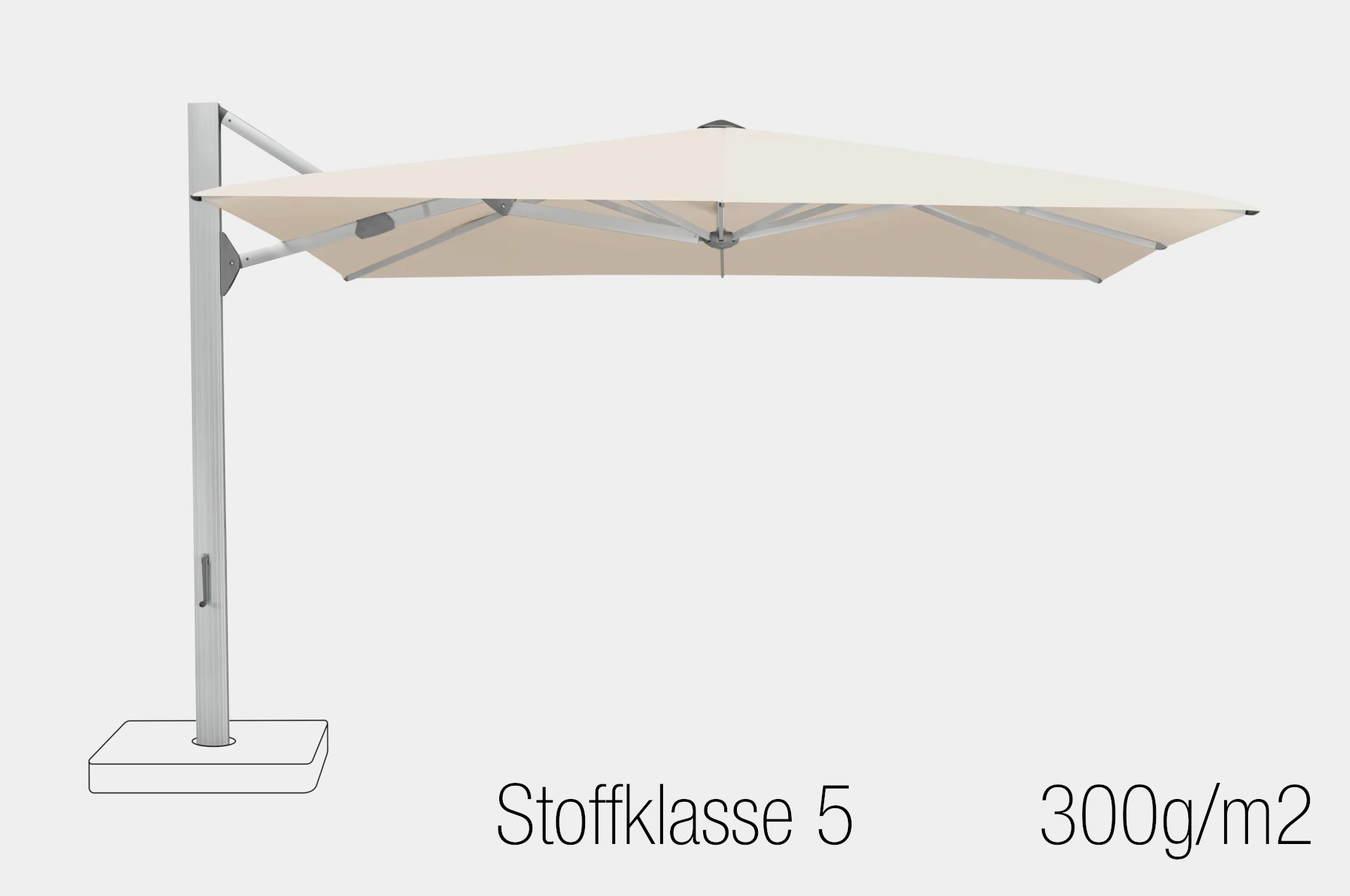 Für diesen Sonnenschirm existieren pro Stoffklasse separate Webshopartikel und Farben für das Schirmdach. Die Stoffklasse 2 hat den niedrigsten Preis; die Stoffklasse 5 den höchsten. Drücken Sie unten auf den entsprechenden Link um zwischen den Stoffklassen zu wechseln (es sind nicht alle Modelle in allen Stoffklassen erhältlich).