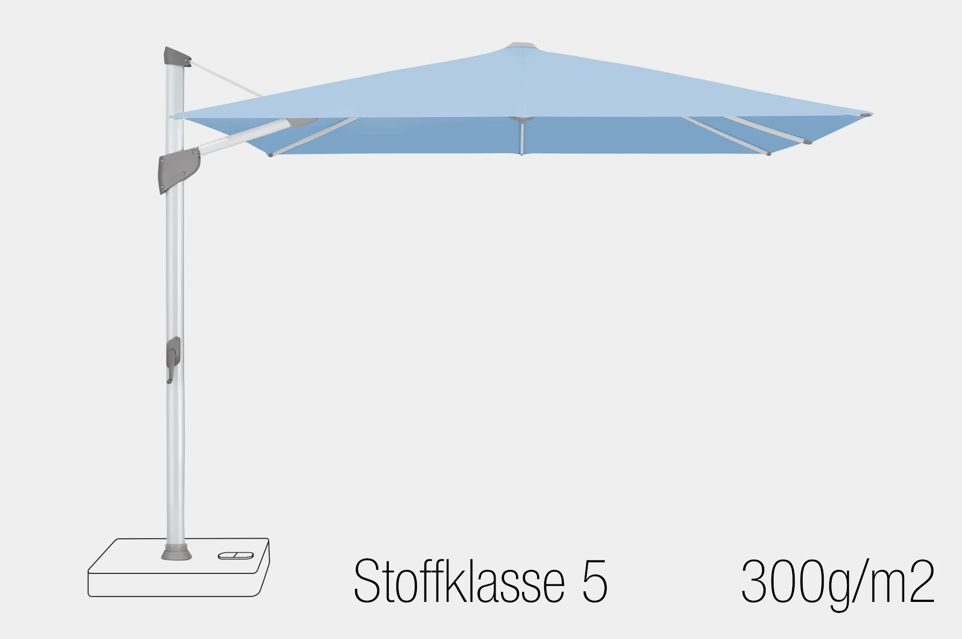 • mit dem optional erhältlichen Drehfuss lässt sich der Schirm stufenlos um 360° drehen