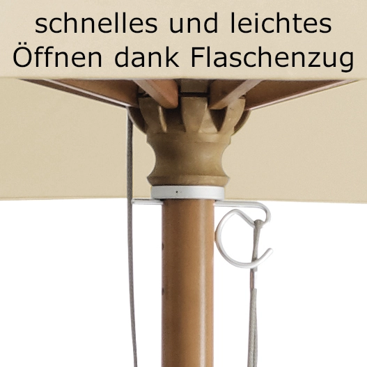 Der Holzschirm Piazzino überzeugt durch sehr einfache Handhabung: Er lässt sich via Flaschenzug schnell und mühelos bedienen. Drücken Sie auf Play für eine kurze Vorstellung dieses Sonnenschirm-Modells (das Video stammt vom Youtube-Kanal der Firma Glatz und gehört nicht uns).