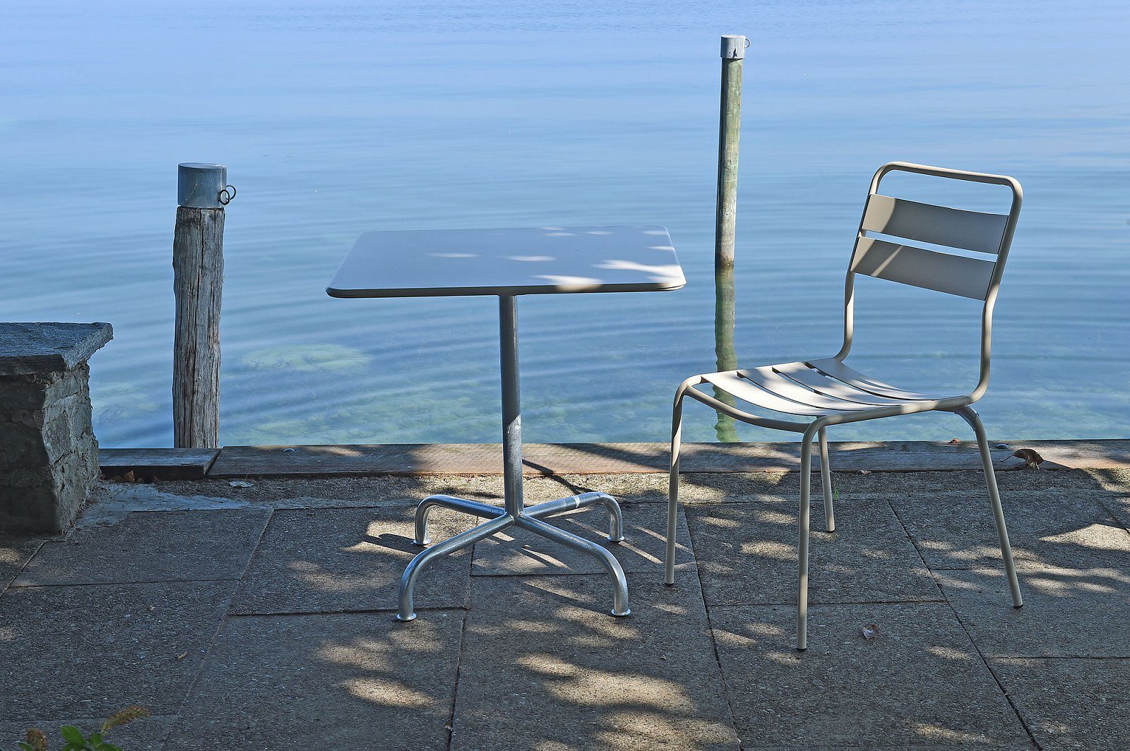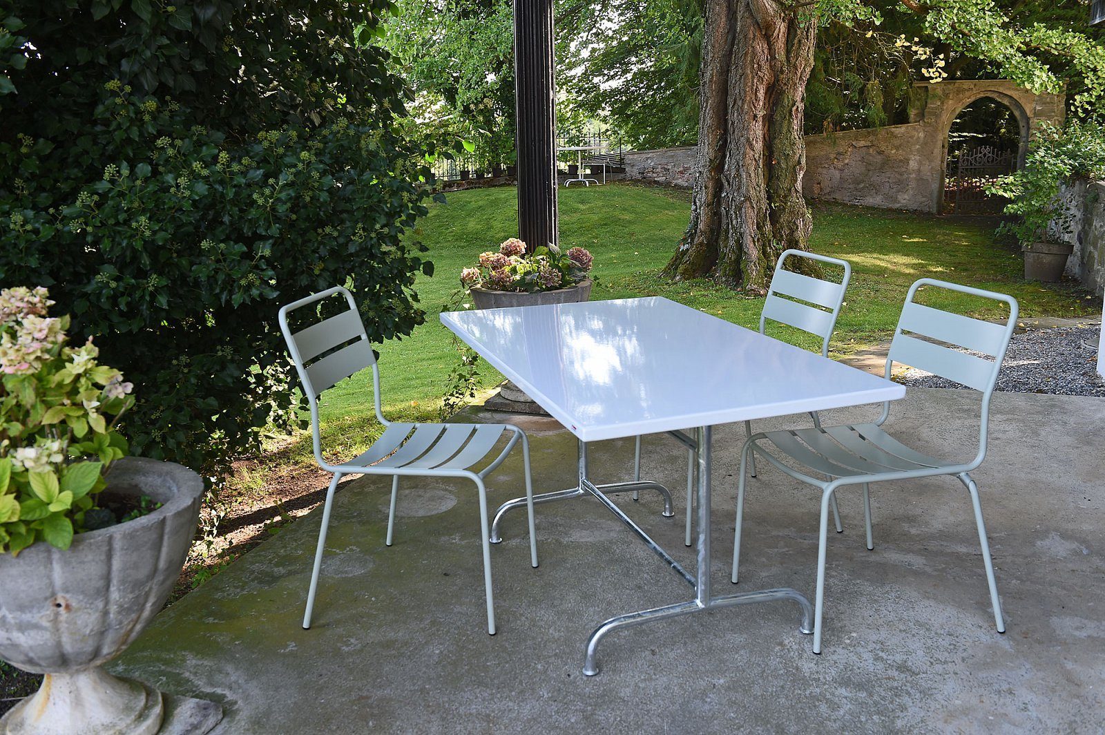 Die Sitz- und Rückenfläche mit geschwungenen Latten aus langlebigem Stahlblech sorgen für Stabilität und geben dem Stuhl Glarus einen angenehmen Sitzkomfort. Das Gestell ist aus feuerverzinktem Stahlrohr gefertigt, was den Stuhl korrosionsbeständig und extrem widerstandsfähig macht – selbst bei intensiver Nutzung und wechselnden Wetterbedingungen.