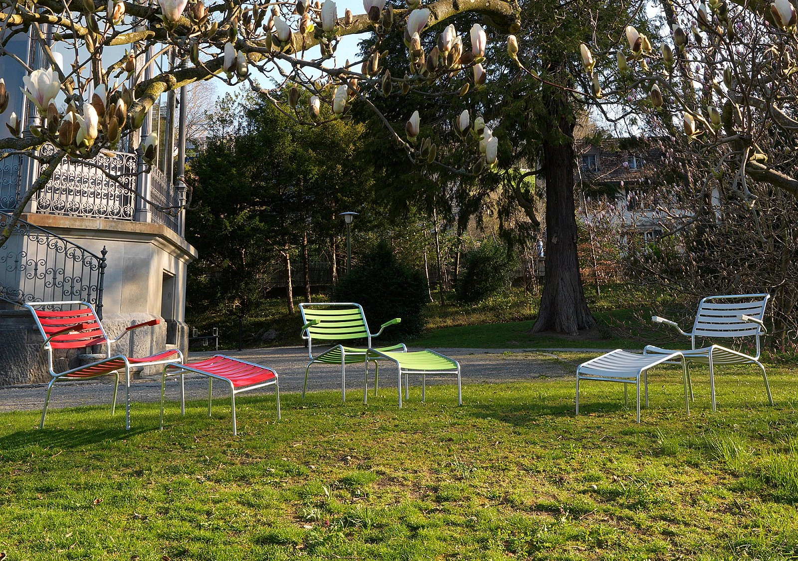 Eine schnelle und mühelose Reinigung von Stahlrohr, Kunststoffschnüren und PVC-Latten gelingt mit herkömmlichem Seifenwasser. Je nach Verschmutzungsgrad empfiehlt sich, solange die Verträglichkeit mit dem Material und dem Oberflächenfinish gewährleistet ist, auch die Verwendung von Möbelpolitur oder Autopolitur.