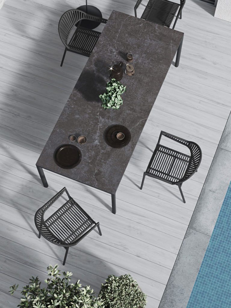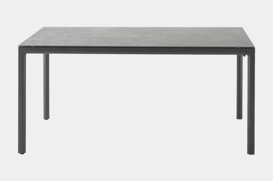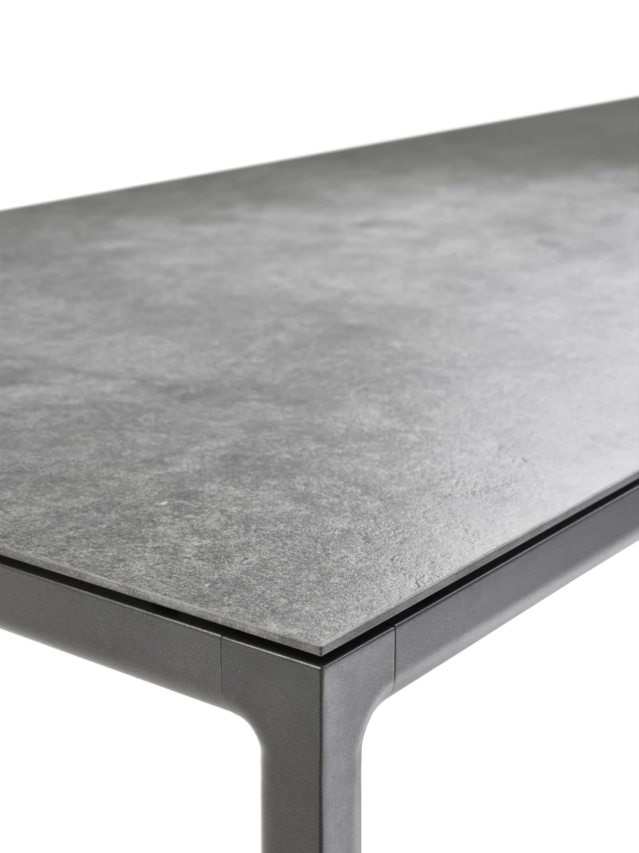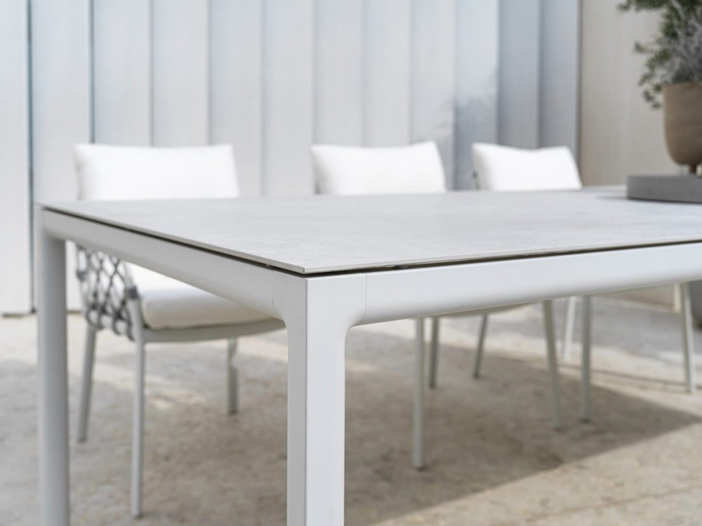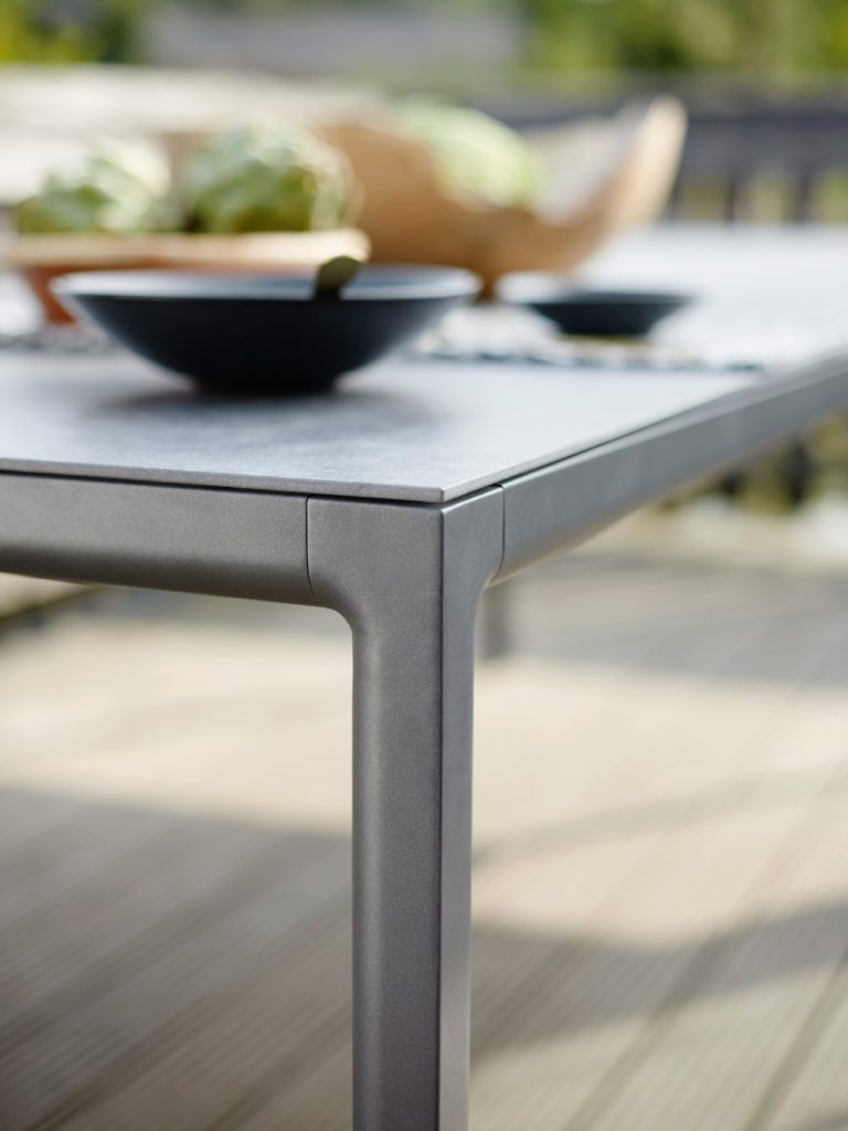 Der Sofia Esstisch verfügt über ein schmales, raffinertes Rahmenprofil mit kantigen Aussenseiten, die nahtlos in weich gerundete Innenseiten und Tischbeinverbindungen übergehen. Das Gestell aus pulverbeschichtetem Aluminium trägt wahlweise eine Tischplatte aus Keramik, Dekton, HPL oder Teakholz und ist in unterschiedlichen Grössen und Dekoren als Fixtisch und als Ausziehtisch erhältlich.