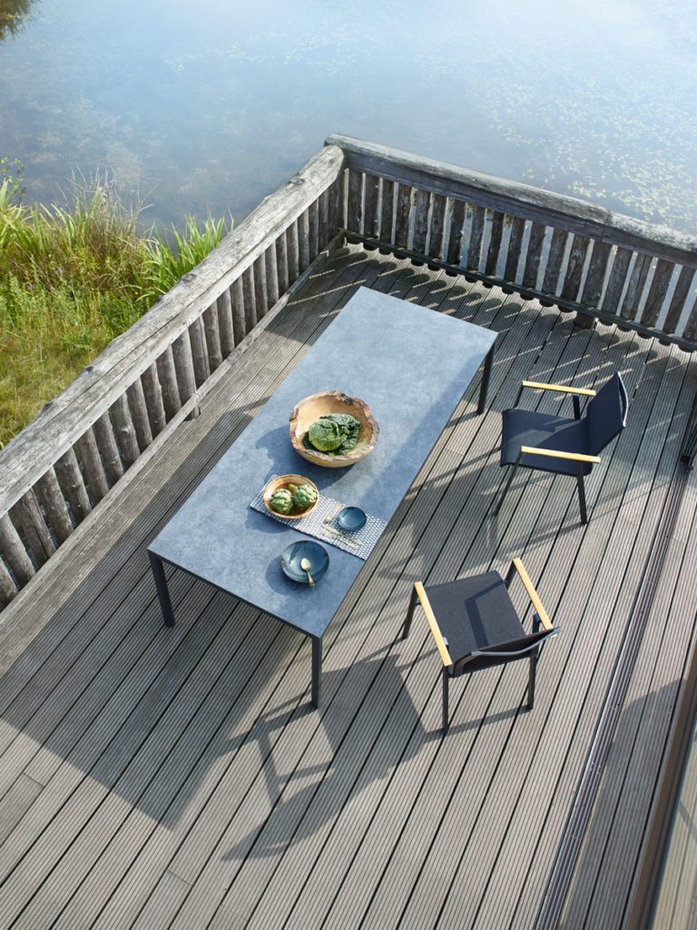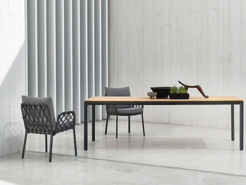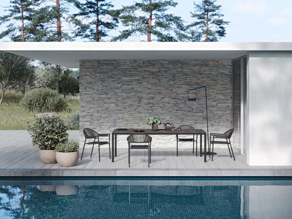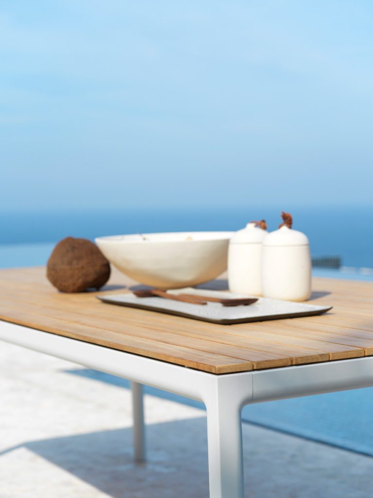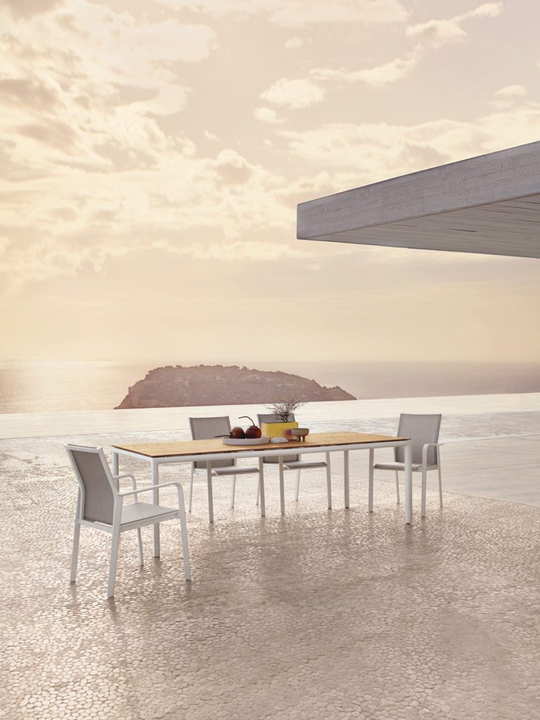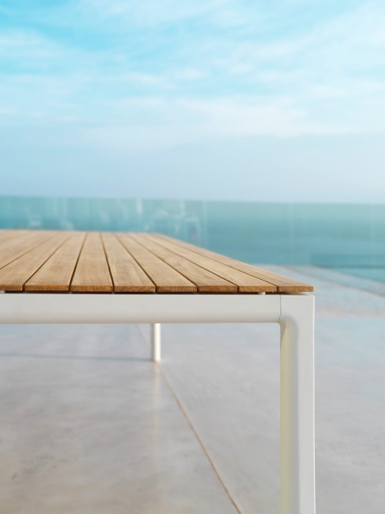 Der Sofia Esstisch verfügt über ein schmales, raffinertes Rahmenprofil mit kantigen Aussenseiten, die nahtlos in weich gerundete Innenseiten und Tischbeinverbindungen übergehen. Das Gestell aus pulverbeschichtetem Aluminium trägt wahlweise eine Tischplatte aus Keramik, Dekton, HPL oder Teakholz und ist in unterschiedlichen Grössen und Dekoren als Fixtisch und als Ausziehtisch erhältlich.