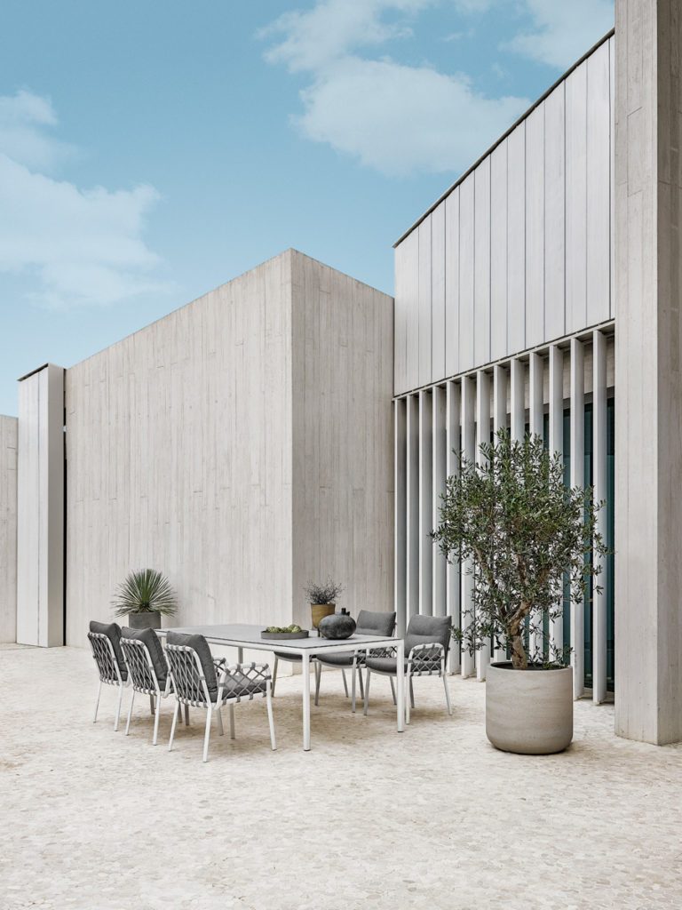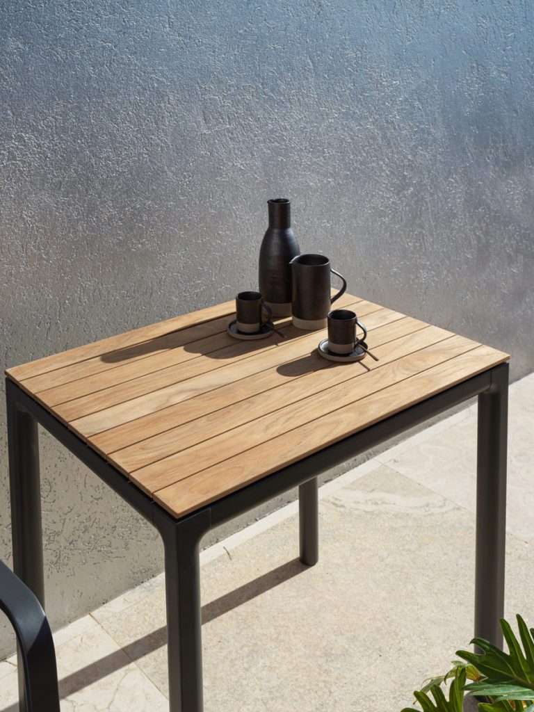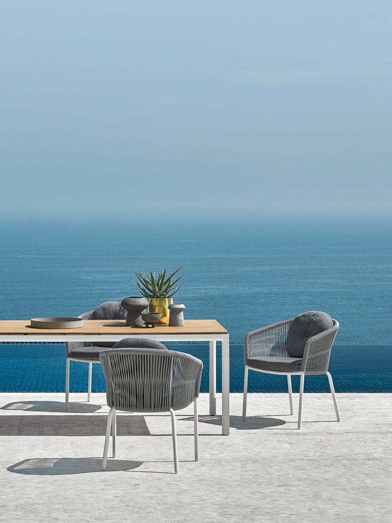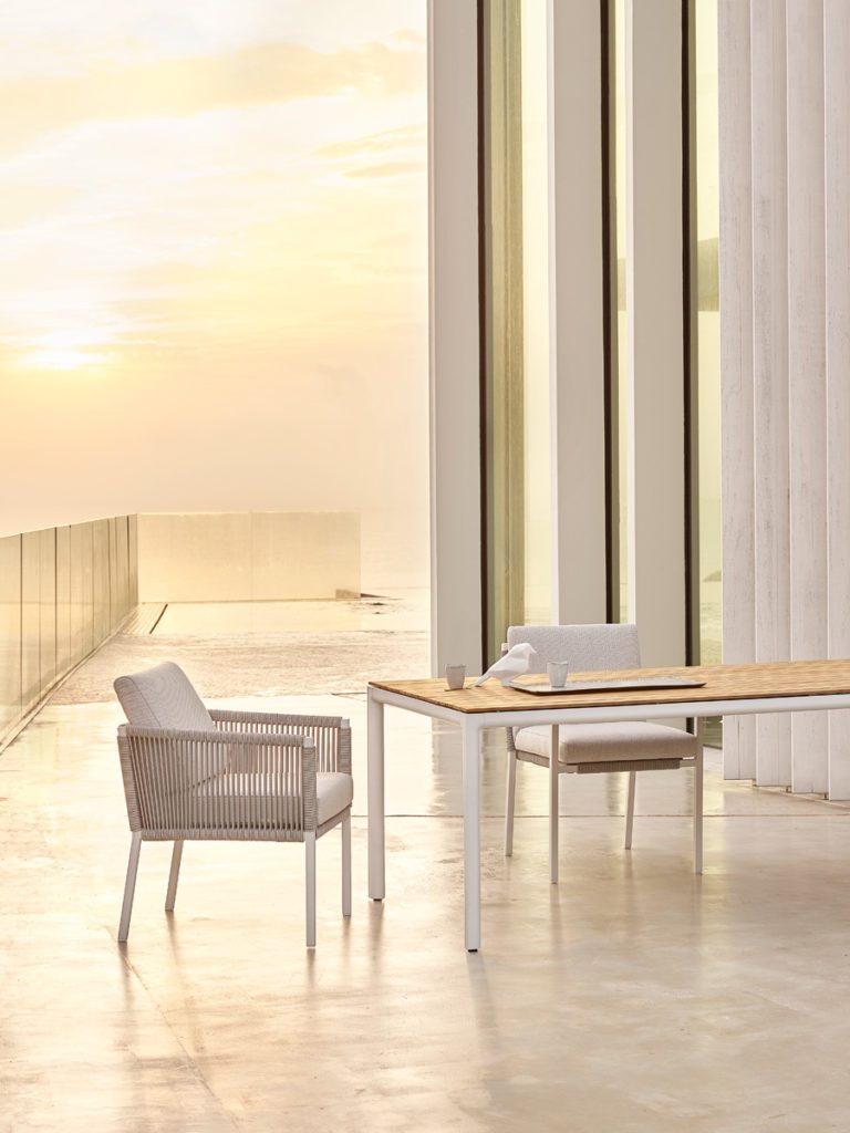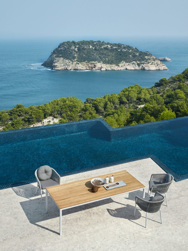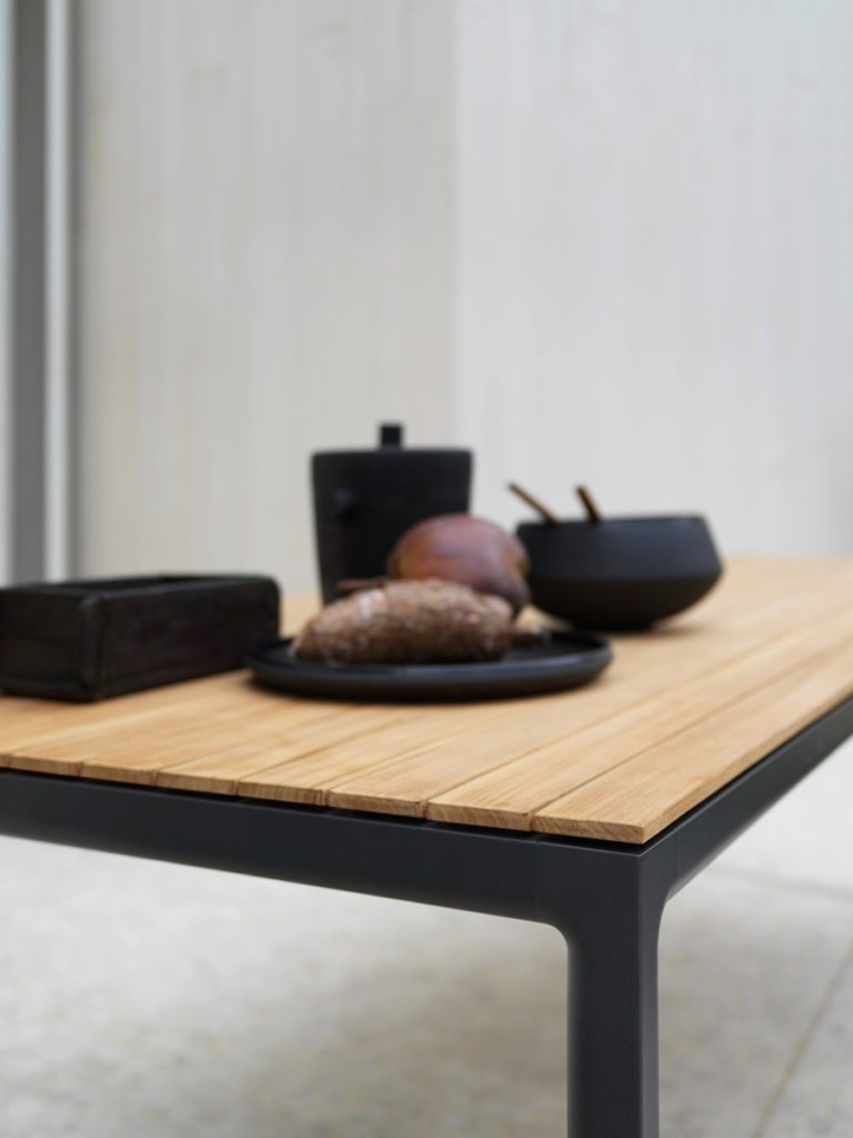Der Sofia Esstisch verfügt über ein schmales, raffinertes Rahmenprofil mit kantigen Aussenseiten, die nahtlos in weich gerundete Innenseiten und Tischbeinverbindungen übergehen. Das Gestell aus pulverbeschichtetem Aluminium trägt wahlweise eine Tischplatte aus Keramik, Dekton, HPL oder Teakholz und ist in unterschiedlichen Grössen und Dekoren als Fixtisch und als Ausziehtisch erhältlich.