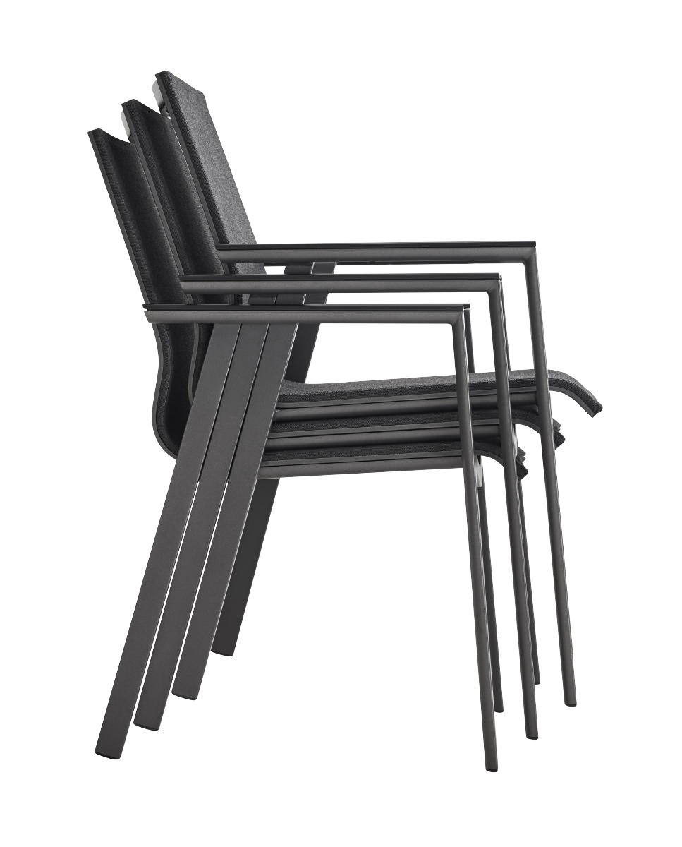 Das Design vom Stapelsessel Solo ist geprägt von einer durchgehenden, sanft geschwungenen, ergonomisch geformten Sitzschale, welche getragen wird von einem geradlinigen Aluminium-Gestell.